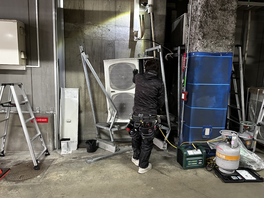 今日はエアコン交換工事で店舗営業終了後からスタート