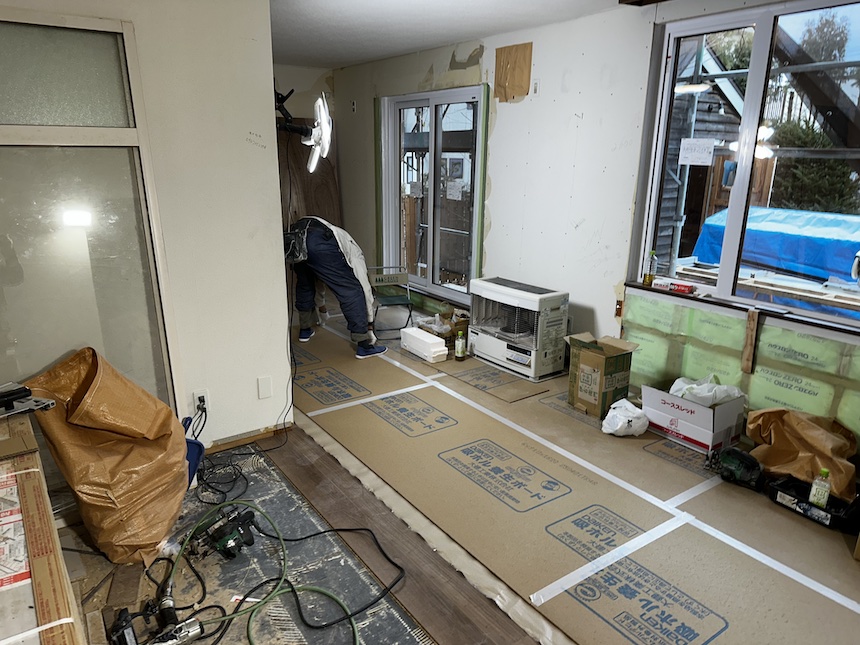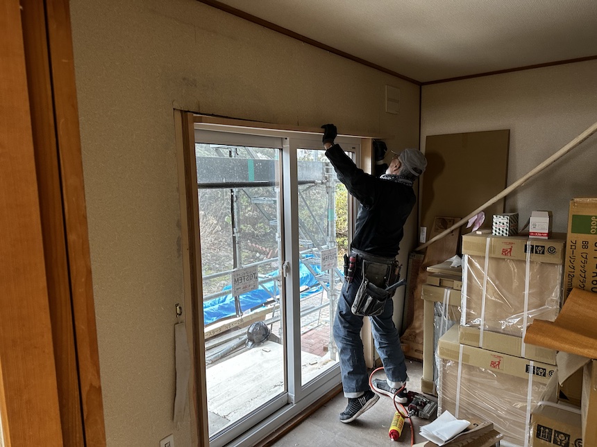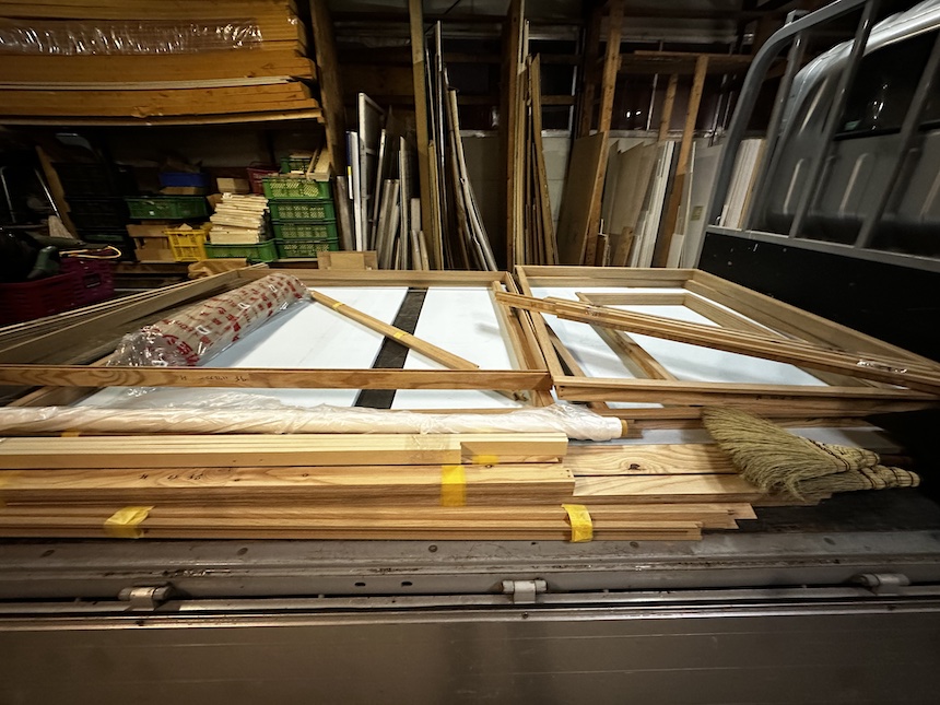 窓の取り付けが終わり、作業場にて内側につける窓枠を加工、和室もカウンターもあるので